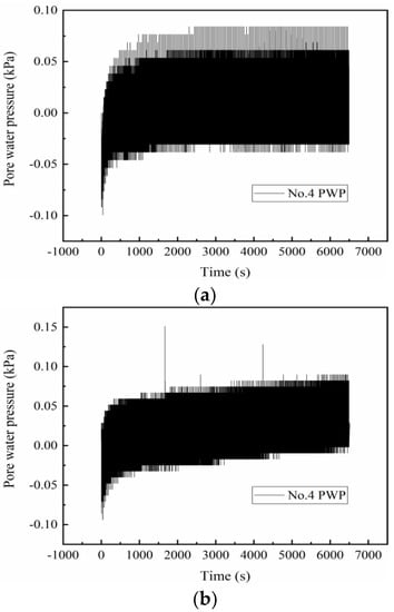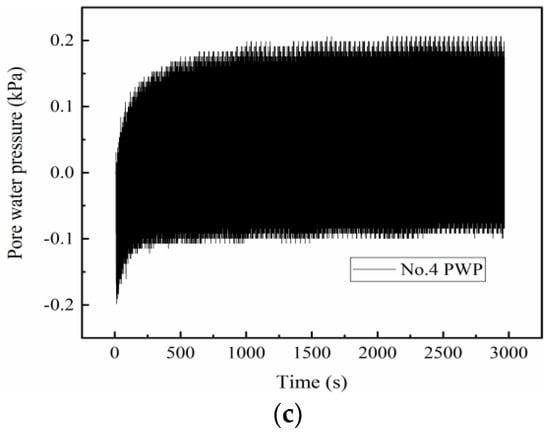 Figure 22a–c, respectively, show the changes of excess pore water pressure monitored by No. 4 porosimeter in the soil under the three working conditions during the long-term circulation of wind, wave and current. It can be seen from the figure that in the initial period of loading, the pore pressures measured in the three groups of tests are all negative values. This is because the pile body vibrates under the load at the initial stage of the load, and a certain gap is generated between the pile and the soil, thereby generating a negative pore pressure. After that, with the action of long-term load, the overall pore water pressure of the soil in the middle of the pile showed an upward trend, but after a certain number of cycles, the increase in the pore pressure tends to a stable value, and the pore water pressure still cyclically fluctuates with the action of the load. The variation trend of pore water pressure of No. 4 porosimeter in the three groups of tests is similar, but the results of pore pressure are different due to different load amplitudes.