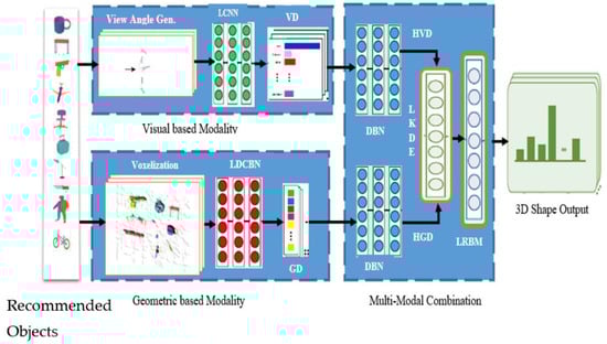 In this section, we propose a novel feature fusion approach that combines extracted multimodal data. The visual and geometric descriptors denote visual and spatial characteristics, respectively, of recommended objects. Hence, for recommended objects, the two descriptors complement each other and both geometric and visual feature information are complex and extremely non-linear in nature. In our approach, to analogously associate the two, high-level descriptor information is captured from feature descriptors. This is done to visualize or bring to prominence, the high-level features with the properties of the recommended model. This means the model becomes more discriminative to recommended 3D models rather than with some specific modalities. Consequently, both the high-level visual and geometric descriptors are extracted using DBNs just as described in [44]. This is done through a greedy learning, layer-by-layer bottom-up approach, which is acknowledged to be very effective. LRBM is then employed to analogously associate both descriptor modalities in learning multi-modal feature fusion for recommended objects. The function of LRBM is as stated in Equation (10):