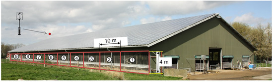 This study was based on measurements obtained from an experimental dairy barn (shown in Figure 1) in the northeast of the city of Rostock, Germany. The barn’s dimensions are 96.15 m by 34.2 m; its metal roof has a triangular shape, with the gable top reaching a maximum height of 10.7 m, decreasing to 4.2 m at the lowest point (on the sides). The total volume of the barn is 25,500 m. The floor is solid concrete and is cleaned every 90 min by an automatic scraper. The manure then is moved by the scraper to manure pits outside the barn. The barn is naturally ventilated, with open side walls. On very cold winter nights, when the temperature drops down to the negative values, the side walls are closed using a polyethylene film. For additional ventilation under warm and low-wind conditions, four cooling fans (Powerfoil X2.0, Big Ass Fans HQ, Lexington, KY, USA) are installed on the ceiling above the feeding alley. A more detailed description of the barn can be found in previous publications [14,24,26,27].