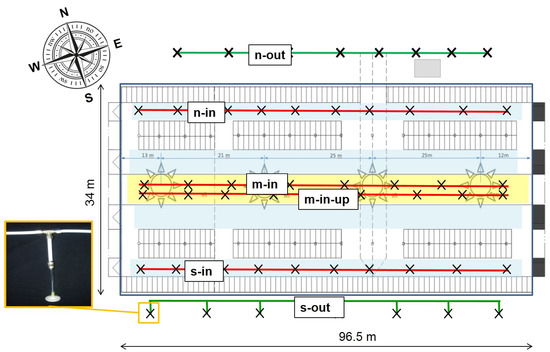 Gas concentrations both outside and within the barn were measured using sample lines, polytetrafluoroethylene (PTFE) tubes with an inner diameter of 6 mm equipped with capillary traps every 8–10 m to ensure constant volume flow over the whole length (Figure 2). The sampling lines were positioned according to Figure 2, with two lines outside the barn (at the southern (s-out) and the northern openings (n-out), and four lines inside the barn (n-in, m-in, m-in-up, and s-in) ). The gas concentrations were measured with a FTIR spectrometer (Gasmet CX4000, Gasmet Technologies Inc., Karlsruhe, Germany) capable of switching between sample lines using a manifold. Each of the six lines was measured for ten minutes (4 min spent flushing the measuring cell and 6 min of measurement). Using this procedure, all lines could be measured sequentially each hour.