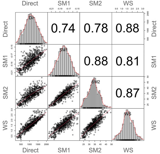 Bivariate scatterplots (Figure 3) show acceptable agreement between the direct method and SM2 (coefficient of determination is 0.61), whereas SM1 has higher dispersion around the fitted line (coefficient of determination is 0.55). We noticed that the two indirect methods are strongly correlated (3rd column, 2nd row). The scatterplots obtained for wind speed and direct methods are also in a good agreement.