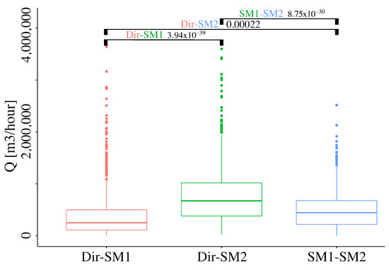 Figure 4 shows the calculated pairwise differences of measured volume flow values with the three methods as boxplots. Comparison obtained for the pairs Direct-SM1, Direct-SM2, and SM1-SM2 is displayed. It is seen that boxplots are overlapping, That is why a Bonferroni t-test was carried out in order to identify the existence of significant differences between the mean values in the groups (Direct and SM1; Direct and SM2; SM1 and SM2). The p-values obtained using the Bonferroni t-test showed significance with the confidence interval of 95%, presented on top of the figure. Looking more specifically on each part, we can conclude that the pair “Dir-SM1” shows the lowest differences and again, Q values obtained via SM1 corresponds better with the direct method. The pair “Dir-SM2” shows higher differences and less correspondence with the direct method. The pair “SM1-SM2” shows that even between the indirect methods, the Q values are highly different.