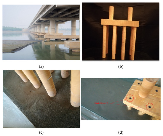 The experimental model is the scaled archetype of Pakhtoon Gari bridge (Figure 2a) situated across the river Kabul (34.021 N, 71.832 S Google Earth). This bridge is a multiple-span bridge composed of prestressed concrete I beam and a concrete deck supported on concrete stub abutments. The total span length between the bridge’s abutments is 420 m with 14 equal spans of 30 m center to center between the piers. The bridge is supported by a piled foundation with 104 piles in the piers and 20 piles in the abutments. The pier piles are arranged in a group of 8, laid out in a rectangular grid pattern of 2 × 4 piles. The individual pile is 750 mm in diameter, where the embedment is 28 m in piers and 18 m in abutments.