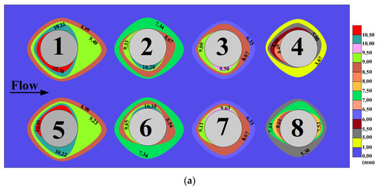 Figure 8 shows that the piles facing the water current first experienced maximum scouring compared to the preceding group of piles. It can be seen that the frontal area of upstream piles 1 and 5 experiences the maximum local scour of 10.7 mm and 10.65 mm. As regards the square piles, the same trend is observed in circular piles, with the scouring of 44.3 mm and 42.7 mm at the upstream piles 1 and 5. Notably, scouring at the downstream piles is less than at the upstream pile. The reason lies in the fact that as the water flows through different piles, the flow velocity decreases, thereby leading to a less intense horseshoe vortex. Moreover, the scouring material from the front scour holes is deposited in the rare scour holes, decreasing the scour depth at the rare piles. This phenomenon can be seen in Figure 6c, where the rear two downstream piles remain in their original position while the rest of the six piles displace. The main reasons are the excessive soil erosion in the upstream piles and the interaction of the scour holes.
