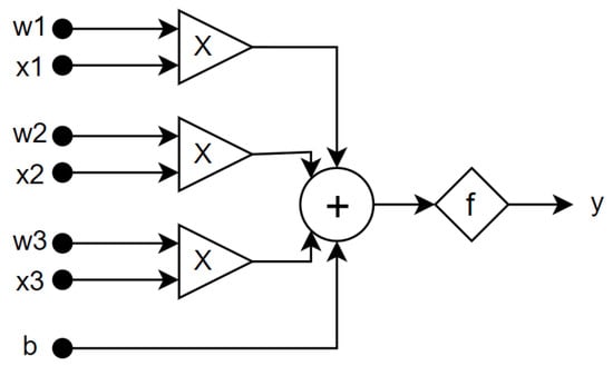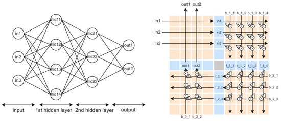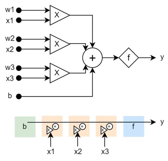 26], the proposed accelerator architecture is based on the principle of atomic implementation of processing elements. This means that PE has a simple structure and performs very simple operations. This decision makes it possible to achieve high flexibility of the computing environment and allows fine-tuning of each parameter. By analyzing classical feedforward networks, a set of PE operations was selected: “signal source”, “signal transfer”, “MAC”, “ReLU”, “sigmoid” [