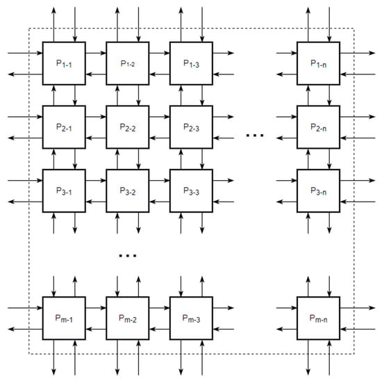 29]. The PEs are arranged in a regular grid and are connected to neighboring PEs. Each PE can be individually configured by an external signal or internal rule to perform some operation from a predefined set. The collaborative operating of many independent processors allows implementing complex parallel algorithms. Thus, the computational capabilities of RCE are limited only by its size and operations set.