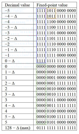 symbol denotes the smallest step for this number format, and it is equal to 1/256 for numbers with 8 fractional bits. Therefore, the PE must include 11 comparisons. At the same time, the fixed-point format puts the integer part of the number in high order bits. Our models use 16-bit fixed-point numbers, and the 8 high order bits contain an integer part.
