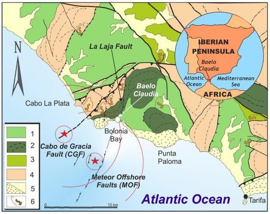 Geological context of the Bolonia Bay showing the most important fault systems in the central area of the Strait of Gibraltar and the most probable seismic sources (CGF and MOF) in the area responsible for the earthquake in the fourth century AD (red stars). Legend: (1) Cretaceous–Eocene Almarchal Fm. (clayey marls and limestones); (2) Paleogene Bolonia Fm. (red clays and limestones); (3) Lower Miocene Facinas Fm. (clayey olisthostromic unit); (4) Miocene Aljibe Sandstones and Algeciras Fms. (flysch units); (5) Pliocene (with circles) and Quaternary post-orogenic materials; (6) Major landslides identified in the area. Stratification directions and subvertical folds are identified with dashed lines. Normal faults (with squares) and reverse faults (with triangles) are identified using conventional symbology. Modified from Silva et al. [].