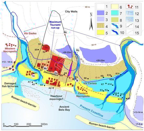 Paleogeography of Baelo Claudia (after [,]). (1) Betic Substratum (Almarchal Fm. Cretaceous–Eocene); (2) and (3) Pleistocene marine terraces; (4) Post-Roman colluvium; (5) Beach barrier (c. 4 ka BP); (6) Roman spit-bar and beach deposits; (7) Lagoon and river coastal floodplains; (8) Modern fluvial terraces; (9) Active channels; (10) Paleo-channels; (11) Roman buildings; (12) Harbor moorings; (13) Submerged ashlars and blocks; (14) Scarps; (15) Flooded areas, late fourth century CE. S1–S5, boreholes []; A1–A5, sample sites []; R1–R4, sample sites []; K1–K11, boreholes []; P1–P3, tsunami sample sites [].