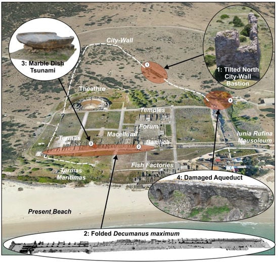 - Silva, P.G.; Elez, J.; Carrasco, P.; Santos, G.; Pérez-Tarruella, J.; Giner-Robles, J.L.; Roquero, E.; Reicherter, K.; Garcia-Jiménez, I.; Prados Martínez, F.; et al. Archaeoseismological analysis of the late 4th century tsunami event devastating the Roman City of Baelo Claudia (Gibraltar Arc, South Spain). In Proceedings of the 10th International INQUA Meeting on Paleoseismology, Active Tectonics and Archaeoseismology, Hornitos, Chile, 8–12 November 2021; p. 67. [Google Scholar]