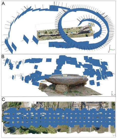 The use of 3D technologies and modelling in archaeology has experienced a rapid increase during the two last decades. Different topographic methodologies have been used over the last years for the survey of archaeological structures, including Terrestrial Laser Scanning (TLS) [], aerial survey with Laser (LiDAR) and the use of photogrammetry from cameras; however, drones [] help us to take high-resolution images with an accurate topographic positioning of each image []. They also make it possible to program specific flights with the desired conditions around the element to be modeled, making the pre- and post-processing work much more efficient, fast and accurate, thus offering relevant time and cost efficiency.