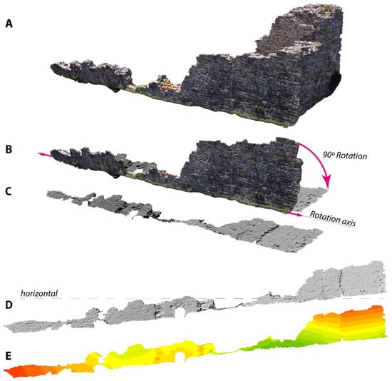 Not only in the archaeoseismological scenarios, but in any current seismic scenario, it is common for buildings to suffer deformations and damage in the walls. These deformations, in many cases, are very characteristic and easily identifiable (e.g., [,]), but given their location in vertical areas and far from the ground, they are difficult to access; therefore, they present difficulties for parameterization and quantification. In addition to this, DEMs are usually obtained (and computed) as elements in “plan view”, the same as in traditional topography. To apply the full potential of GIS to this type of vertical element, such as walls, we decided to treat the elevation view of the walls of the buildings as maps with their own topography. In this case, we decided to apply this workflow to the North City-Wall Bastion of Baelo Claudia, specifically the east side of the city wall, which presents a remarkable level of preservation (Figure 3 and Figure 5). This wall is N162E-oriented, shows strong deformation (both in the form of vertical axis folds and fractures) and nowadays is nearly vertical (Figure 3). For this work, once the appropriate photogrammetric reconstruction was performed in 3D (Figure 5A), we proceeded to isolate the data related only to the E wall of the architectural element. Once the photogrammetric reconstruction points of the 3D mesh were isolated, they were rotated 90 degrees clockwise from the base of the wall and with the axis parallel to the main direction of the wall (Figure 5B,C). This allowed the topographic reconstruction of this wall panel from almost vertical to almost horizontal (Figure 5C,D). This was done without distorting the overall dimensions of the reconstruction, just a rotation. The election of the main direction and the location of the rotation axis was relevant to illustrate the correct dimensions of the deformation suffered. In this case, we located the axis tangent at the most external part of the wall, cero vertical deviation (green colors in Figure 5E). In seriously deformed structures, it can be difficult to locate a “main direction”, and it is recommended to segment the study area into areas with similar characteristics to minimize subjectiveness.