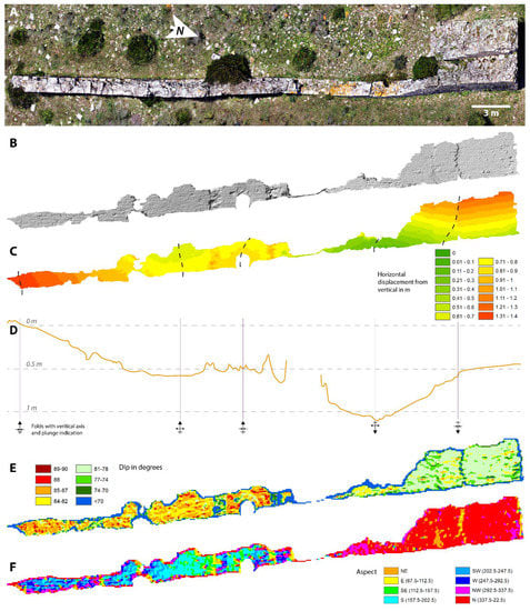 Once a DEM of the eastern canvas of the wall was obtained and rotated 90º for convenience (see Figure 5 in the methodological section), a series of derived models could be obtained. As usual, the hillshade model gave us a perception of the visual morphology of the reconstructed element, from which we can interpret and map the best-observed deformation features, in this case, the fractures (Figure 6B). On the other hand, a hypsometric distribution allowed us to characterize the domains/segments of the studied canvas that were tilted in a similar manner, which were also quite visible in the bastion (see Figure 6C). Additionally, the set of tilted domains defined the zones in which vertical-axis folds developed; these were very visible both in the wall near the bastion and southwards. This set of folds can be characterized in several ways and through various classical GIS algorithms, such as topographic profiles (Figure 6D), slope (Figure 6E) or aspect (Figure 6F). Based on the several obtained models, these vertical folds that developed on the city wall range between 11 and 6 m in wavelength, with maximum amplitudes of c. 30 cm and a minimum of only 9. It is worth noting that the axial trace of the folds was not rectilinear (Figure 6C), and the axial plunge (inclination direction of the fold axis) varied along the studied area, from eastward in the northernmost sector of the city wall to westward towards the south (Figure 6D). The axial plunge was also different for both sets of folds, in the range of 81–78° for the northernmost ones and of 82–88° for the southern ones.