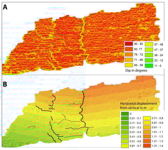 (A) Dip in degrees of the most northeastern part of the east side of the city wall (for location, see Figure 5A). (B) Interpretation of the fractures (faults) accumulating fragile deformation and delimitating sectors with similar tilting in the city wall over the hypsometric distribution of the horizontal displacement from vertical in the city wall, characterizing the different tilted sector in the city wall. Models A and B were obtained from a DEM with 1 mm of pixel resolution.