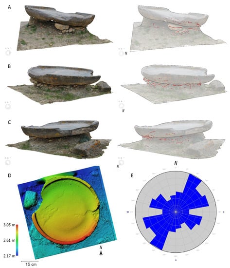 The models obtained in this study highlight the use of 3D modelling in the characterization and parameterization of earthquake damage in archaeological sites. In a next step, the set of Earthquake Archaeological Effects (EAEs) according to the classification of Rodríguez-Pascua et al. [] would be digitally standardized for their automatic recognition and parametrization from drone-produced 3D models. In a further phase, their implementation in properly improved GIS environments with specific algorithms will be possible to produce automated 3D maps and models for oriented damage, facilitating low-cost archaeoseismological evaluations of sites or historical buildings from drone surveys.