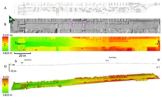 (A) Folds and deformational structures related to the CE VI s. earthquake in the Decumanus maximus mapped in a conventional topographic map, modified from Silva et al. []. (B) Hillshade model derived from a DEM obtained from drone aerial photogrammetry; area of the Decumanus maximus. Purple rectangles indicate folds E (1) and F (2) in Figure 9. (C) Hypsometry of the DEM of the Decumanus maximus obtained from drone aerial photogrammetry; note that the total differential elevation accounts for 5.339 m in more than 180 m. (D) Topographic profile from b to b’ (see location in C) without vertical exaggeration. A gentle folding in the paving of the Decumanus maximus can be seen. (E) A 3D view from the SW of the Decumanus maximus; note the overall folding of the street.