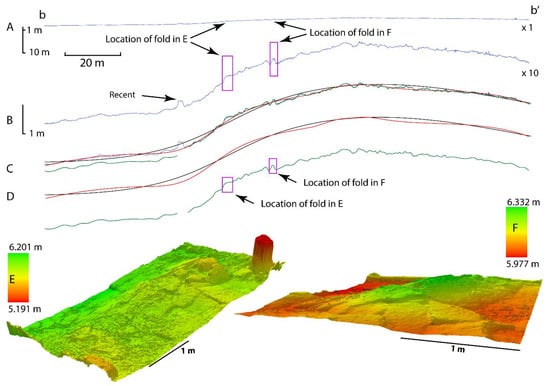 (A) Topographic profile obtained from a 3 mm pixel DEM obtained from drone photogrammetry, from b to b’ (see Figure 9 for location) and without vertical exaggeration. (B) Same topographic profile, from b to b’, with ×10 vertical exaggeration. (C) Superimposed mapped fold geometry from the exaggerated topographic profile showing different amplitude and wavelengths from several tens of m (black) to a couple of tens of m (red) to individual metric folds (green). (D) Disaggregated fold geometry, with the comparison of the larger folds (black and red, up) and individualized minor folding (green, down). (E) Example of the smaller folds with centimetric amplitude and metric wavelength; those folds were probably constrained by the dimension of the slabs of the paving; see location in D, A and Figure 9. (F) Example of the smaller folds with centimetric amplitude and metric wavelength; note the periclinal termination of the fold at both extremes of the structure and the amplitude of some 35 cm; these structures were identified and previously mapped in Silva et al. [].