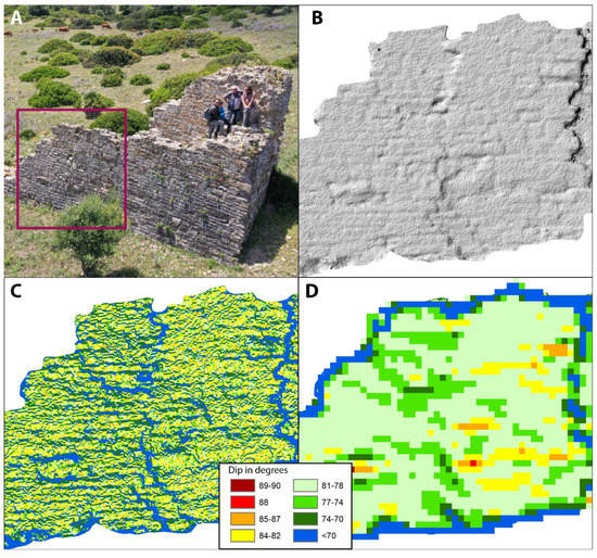 Moreover, from the photogrammetric restitution of drone aerial imagery in GIS environments can be obtained DEMs with several resolutions. In the most detailed restitutions, even models with a submillimetric pixel resolution can be obtained. In this regard, we evidenced that higher resolution models are not always better and that resolution models adapted to each specific study case can improve the identification and parametrization of key elements in the damaged structures. Figure 11 illustrates the influence of the DEM resolution on the final outcomes (3D models), where the choice of an adequate pixel size is critical to highlight the general slope of the studied wall section. The 5 cm/pixel DEM in Figure 11D clearly displays an overall dipping of the wall between 78–82°, which is nearly masked in the 3 mm/pixel DEM in Figure 11C, since the pixels are too small, generating an extremely precise DEM. On the contrary, these detailed DEMs allow a better identification and definition of linear features, such as fractures (Figure 11B,C).