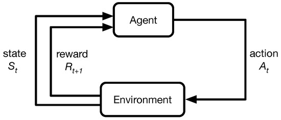 The RL problem is modelled by Markov Decision Processes (MDP), as shown in Figure 1. At a time t, facing the environment, which is represented by a state , the agent selects and executes an action. In return, it receives a reward that allows it to evaluate its decision making. Subsequently, the agent now receives a new state , and again, selects a new action , then receives a new reward , and continues, again and again, improving its behaviour [7]. The Markov property assumes that the next action only depends on the current state but not any other previous state.