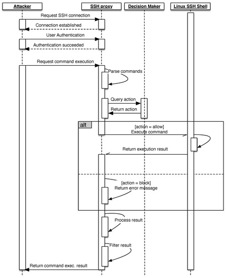Figure 3 shows the UML sequence diagram that illustrates the interaction between the attacker and Asgard as well as Midgard. The interaction starts when an attacker initiates a secure connection to the SSH proxy. After a connection is established, the attacker can try to log in by using a username and password. Once the authentication is successful, the attacker can send commands to the proxy. The proxy will examine the request and use it to query an action from the decision-making module, which implements the learning algorithm as described in Algorithm 1. If the action is allow, then the command will be forwarded for execution in the Linux container system. After the command is executed, its result is sent back to the proxy, which returns it back to the attacker. Alternatively, if the action is block, the proxy will return an error message ‘command not found’, and, finally, if the action is substitute, the command will not be executed, but the proxy will fake its execution by returning an empty message, which indicates that the command was successfully executed. After the command is executed, the execution result is sent back to the proxy to process and filter out some information before it is returned back to the attacker.