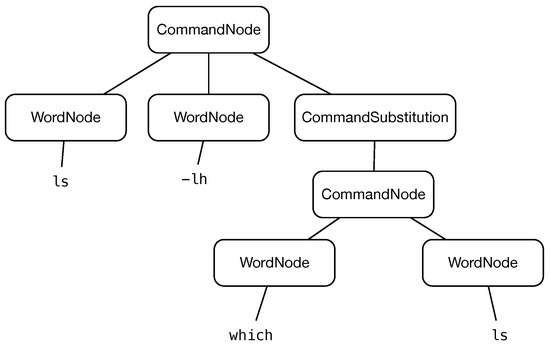 As shown in the sequence diagram Figure 3, after the request of the command execution, this command can be transmitted entirely to the target system and let the real shell handle it. In a normal execution flow, the shell will break it down into tokens of words and operators by obeying the quoting rules of the shell [32]. These tokens have to be parsedto construct a complete abstract syntax tree (AST) [33] that allows the shell to understand how to interpret them. The submitted command can be: a simple command optionally followed by arguments, compound commands (if, for, …), a command with a redirection, a piped command, etc. For example, if it is a built-in shell command (e.g., cd, break, exit, etc.), it will be executed by the shell itself, otherwise, a new process is forked to execute an external command. If there is a redirection of the standard output of a command, the shell has to create a pipe and link it to the redirected file accordingly. For example, this command ls -lh $(which ls) was seen as a way to detect the Cowrie system (as the command substitution was not implemented in the old version of Cowrie), and its AST representation is shown in Figure 4. This AST is made up of a command node as a root node, which consists of three child-nodes: a word node ls, a word node -lh and a command substitution node. The child-node of the command substitution is also a command node comprised of a word node which and a word node ls. Our objective is to take action on each individual command that can be made up of the original command. As a result, the parsing has to be carried out by the proxy system to produce an AST, and from that, it derives a list of commands that can be analysed and decided one by one.