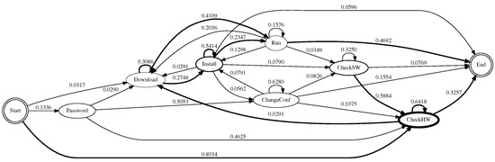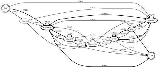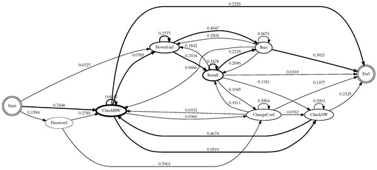 - ChangeConf—‘Change the system configuration’: this describes the operation of attackers that alters the system state by changing the environment variable, terminating running programs, modifying files, etc. The commands included in this state are export, PATH=, kill, nano, pico, vi, vim, sshd, useradd, userdel.