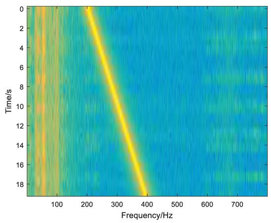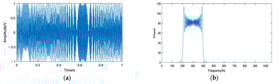 In this experiment, the amplitude of the LFM signal was 1, the starting frequency was 200 Hz, the center frequency was 300 Hz, the sampling frequency was 65 kHz/s, the chirp rate was 200 Hz/s, the sound velocity in water was 1500 m/s, and the transmission duration of the transmitted signal was 1 s. Figure 4 shows the time domain waveform and frequency domain waveform of the transmitted signal. Figure 4a is the time domain waveform of the transmitted signal and Figure 4b is the frequency domain waveform of the transmitted signal.