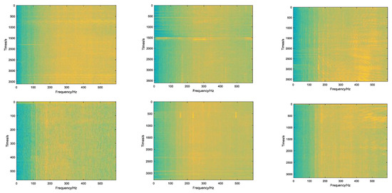 There are both transmitters and receivers in an active sonar system. The transmitter transmits signals continuously. The receiving array element starts to work after the transmitting signal has been transmitted for 1 s to reduce the impact of reverberation and the receiving time lasts for 20 s. The number of receiving array elements was 16 in this experiment, which were arranged as a half-wavelength linear array. At first, we conducted beamforming to enhance the received signal and then the short-term time spectrum could be obtained using the Fourier transform, which was used as the dataset for the target detection model. According to the different characteristics (propeller blade number, shaft frequency, motor noise frequency, signal-to-noise ratio, and target orientation) of targets to be classified, the sample number of each type of target was 2000. We added the background noise of the marine environment as a class of samples and the number of samples was 2000. Assuming that we simulated five types of targets in this experiment, the total number of samples in the final dataset was 12,000. Some of the training samples are shown in Figure 5.