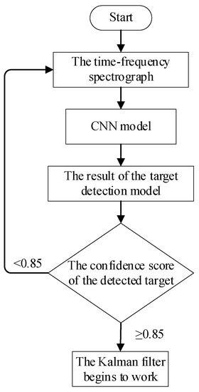The purpose of the target detection model was to confirm the tracking value of the target to be detected and judge whether to start the target tracking model according to the detection results of the CNN model. We could obtain the type and confidence score of the detected target after the model training. When the confidence score was greater than or equal to 0.85, it was considered that the target had tracking value and the Kalman filter started to work. Figure 6 presents the flowchart of the target detection model.