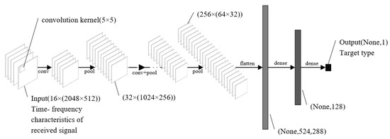 The time–frequency map samples that were obtained in Section 3.1.1 and the corresponding target type were used as of the inputs and output, respectively. The dataset was input into the convolutional neural network (CNN) model for training. By properly adjusting the model parameters, the target recognition accuracy was considerable. When training the model, 70% of the data were used as training samples and 30% were test samples. Figure 7 shows the final model parameters.