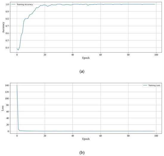 Accuracy and loss of the CNN model after 100 epochs of training: (a) the accuracy of the CNN model after 100 epochs of training; (b) the loss of the CNN model after 100 epochs of training.