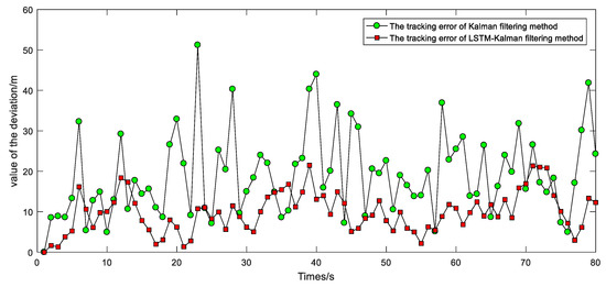 Comparison diagram of the target tracking deviations between the Kalman filtering method and the LSTM–Kalman filtering method.