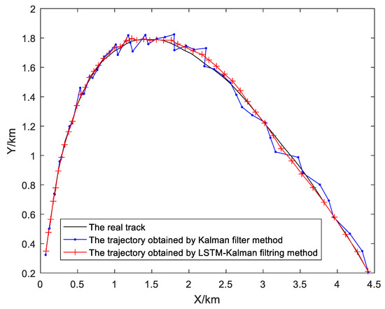 In the simulation experiment, the real path was compared to the tracking results from the Kalman filtering method and the LSTM–Kalman filtering method. Figure 10 shows the final target tracking results.