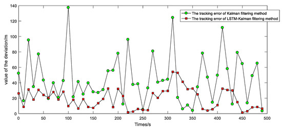 Compared to the real path, the deviations in the UKF were within 140 m, the average error was 42.45 m, and the variance was 21.08. The results from the LSTM–Kalman filtering method were better, the average error was reduced to 16.94 m, and the variance was 4.79. The relative error of the LSTM–Kalman filtering method was 72.25% lower than that of the UKF method. The results showed that the tracking error of the proposed LSTM–Kalman filtering method was significantly reduced compared to the traditional method and that the new method demonstrated a stable and fast tracking performance.