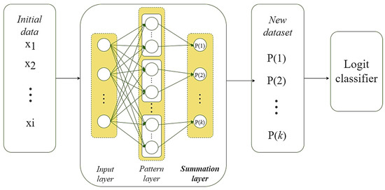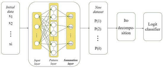 To increase the hybrid system’s accuracy for intellectual data analysis of the problem with a few labeled classes, the authors in [12] proposed a modification of this approach. The modified PNN-Logit schema also uses a PNN-based preprocessing procedure. However, the main difference of this scheme was the nonlinear expansion of the input data space instead of reducing the dimensionality, as in the previous case. The method was to use the outputs of the PNN summation layer to replace the initial dataset and further expand the new dataset space using Ito decomposition [32]. Further classification of the dataset expanded in this way was carried out using Logistic Regression. The flowchart of the proposed approach is shown in Figure 3 [12].