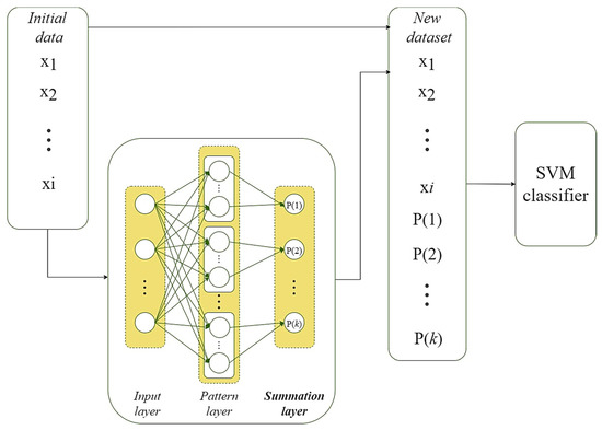 To avoid such shortcomings, Ref. [39] developed a new smart system. It is also based on PNN summation layer outputs, but the fundamental difference here is that they are included as additional features to the initial dataset. The dataset expanded in this way is fed to the selected classifier. The flowchart of the proposed approach is shown in Figure 4 [39].