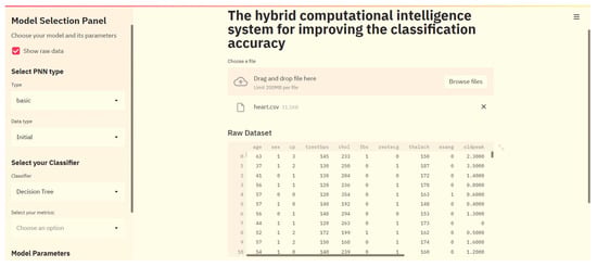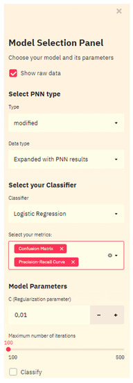 Selecting the PNN type (classical and modified) activates the progress bar, showing how close the program is to complete the network preparation process. When the indicator is filled with blue, a section will appear with the selection of the classifier, namely: “Classifier”—a drop-down menu with different options of classifiers; “Data type”—a drop-down menu with data options on which to set the classifier, according to Table 1. “Metrics”—a multi-choice drop-down menu, with options for visualization of metrics [49] to assess the optimality of the algorithm—confusion matrix, ROC curve, etc. After selecting the above parameters, the section for selecting classifier hyperparameters appears. Finally, a button appears to start the classification and visualization process with user-selected parameters.