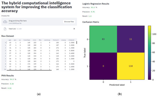 Figure 9. The panel of results of the smart web service: (a) window for downloading and displaying the dataset; (b) a window for presenting and visualizing the results of machine learning models.