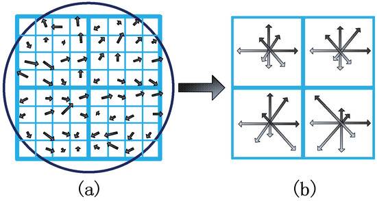 The key point description is the expression of the key point in mathematical language, which is a important step in realizing the matching of image feature points. It describes the key point and the surrounding pixels that contribute to it. The pixel area to be solved is first divided into blocks, and the gradient histogram of the corresponding block is then calculated to generate the direction vector. Therefore, the image information is expressed in an abstract form. As is shown in Figure 3, the gradient value of each block of pixels is Gaussian weighted to obtain eight orientations through which a 32-dimensional vector can be generated to be utilized as the mathematical expression of the key point. Experiments show that, for each key point, using a 128-dimensional vector descriptor to represent the key point can achieve the best effect.