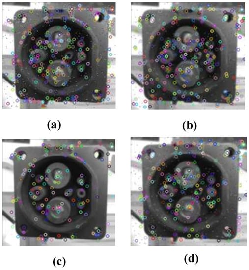 Feature points of filtering processed image: (a) before filtering; (b) by mean filtering; (c) by median filtering; (d) by Gaussian filtering.