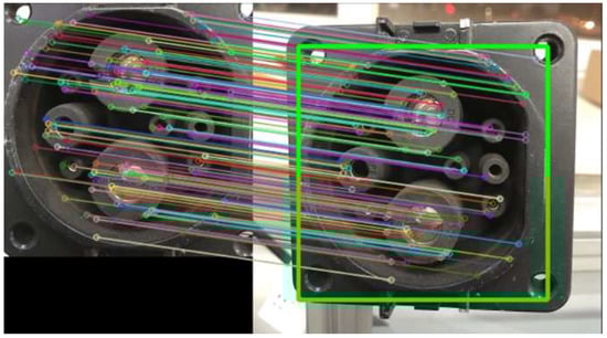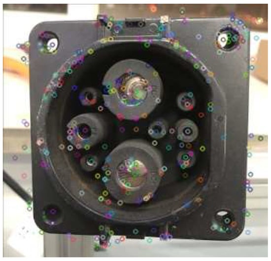 Figure 7 shows the features of the charging port extracted using the SIFT algorithm. It can be seen from the figure that the SIFT algorithm can extract the feature points of the charging port very well. After the extracted features are obtained, the FLANN matcher is utilized to perform feature matching between the feature points of charging port in the image extracted by SIFT and the pre-stored features, and the feature matching result is visualized as shown in Figure 8. It can be seen from the figure that the FLANN matcher can more accurately match feature points in the template extracted by SIFT with the target feature points.