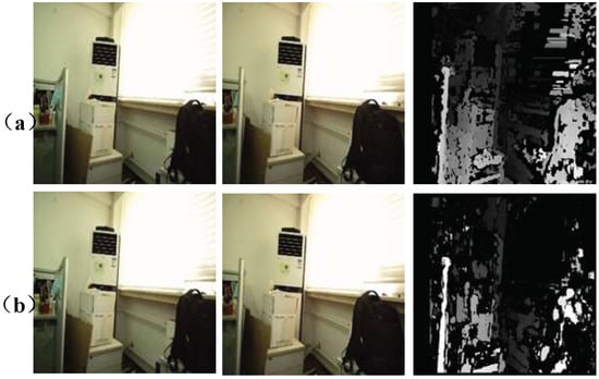 Figure 9a is the disparity map obtained through the SGBM algorithm. The algorithm selects the difference of each pixel to form a difference map, related to which the global energy function is defined and minimized to obtain the optimal difference of each pixel. Figure 9b shows the disparity map calculated by the BM algorithm. The BM algorithm divides the frames of the two cameras into many small squares for model matching. By moving the small squares to match the small squares in the other image, and by finding the pixel positions of different small squares in the other image, combined with the relationship data of the two cameras (rotation matrix and translation matrix in the calibration parameters), the actual depth of the object is calculated to generate the corresponding depth map.