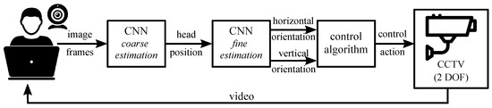 Simplified schematic of the proposed system. Image data captured by a webcam on the operator’s side of the system is evaluated in a coarse-to-fine manner via two independent neural network architectures. The head orientation in vertical and horizontal planes is used to calculate the corresponding control action fed to the CCTV camera mounting.