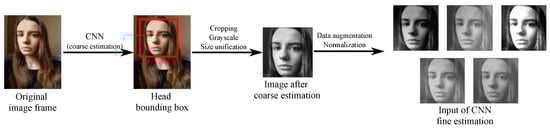 Due to the wide variety of characteristics of the image data, a prior unification of the size was required. The coarse CNN (denoted in Figure 1) was used to this end. The main goal of coarse estimation was to detect the head bounding box. The coarse estimation output data consisted of four corners of the bounding box. The corners of the bounding box were subsequently used to crop the images. The example result of this part of the algorithm is presented as the first step in Figure 3.