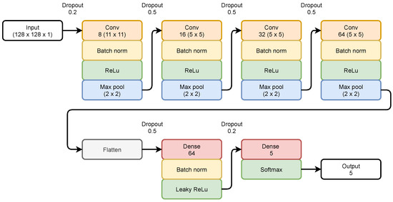 The proposed CNN contains seven layers: four convolutional layers, a flatten layer, and two dense layers. In general, there are 216,501 hyperparameters to train in CNN. Each convolutional layer is followed by Batch Normalization [28] and a ReLU activation function.