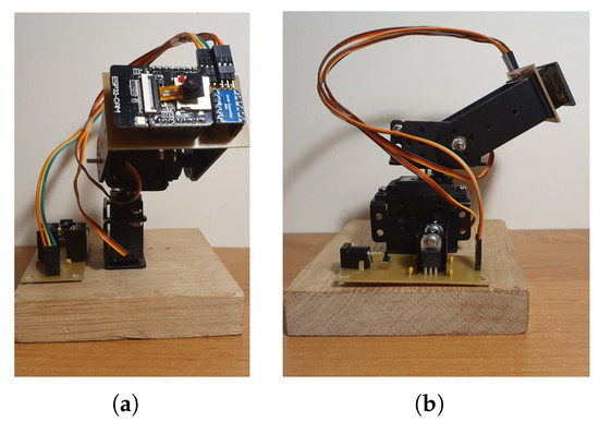 Both servomechanisms considered in this study have a controlled movement range of 180. The first drive, which was attached to the base, does not have an extra limit in the moving range. Therefore, movement is limited to 90 in the left direction and 90 in the right direction. The second servomechanism is attached to the output of the first servomechanism. The movement of the second servomechanism was restricted to 30 sagittal flexion down and 60 sagittal flexion up. The limits are directly connected with the CCTV camera image. This solution avoids pointing the camera at unimportant areas of the building (e.g., ceiling, floor). The ESP32-CAM was connected to the second servo rotor to ensure two degrees of freedom of moving mount.