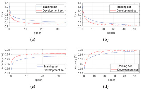 The values of the loss function and the accuracy achieved as a function of the epoch number are presented in Figure 7. In the case of both estimators, the early stopping rule was met before 60 epochs. No overfitting was observed, as the performance was similar for the training and development sets.