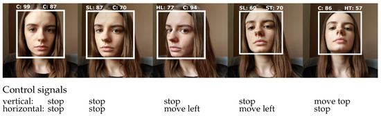 The overall system worked fairly well online. Example image frames with the corresponding head orientation classes, as well as with the resulting control signals, are presented in Figure 8. The white rectangle represents the bounding box (a result of coarse estimation), while the above annotation represents the output of fine estimation (with assigned probability). The control signal is generated in a hysteresis manner, as described in Table 4. To begin to increase the angle of camera mounting, the user needs to achieve the most distant directional orientation for an image frame (approximately 40 ms). Afterward, if the estimated orientation class is not the center, the movement of a mounting is maintained in the previously referenced direction.