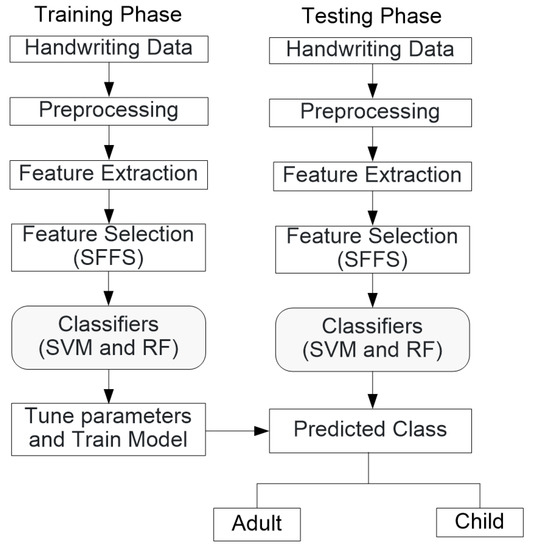 The goal of this work is to propose an ML-based model for predicting adult and child based on their handwritten texts and handwritten patterns. The proposed ML-based framework is presented in Figure 1. First, we divide the handwriting (text and pattern) dataset into two phases: the training phase and the testing phase. We take 80% of the dataset in the training phase and the remaining 20% of the dataset for the test phase. The second step is to preprocess the handwriting data. After preprocessing handwriting data, we extract 30 features and then select an optimal subset of the features using sequential forward floating selection (SFFS). We applied two ML-based algorithms, SVM and RF, for the classification of adult and child. We tuned the hyperparameters of the classifiers (SVM and RF) using a grid search method and trained SVM and RF-based classifiers with five-fold cross-validation protocol. After training, classifiers (SVM and RF) are used in the testing phase for the classification of adult and child. Accuracy, recall, precision, f1-score, and area under the curve (AUC) are used to evaluate the performance of the classifiers.