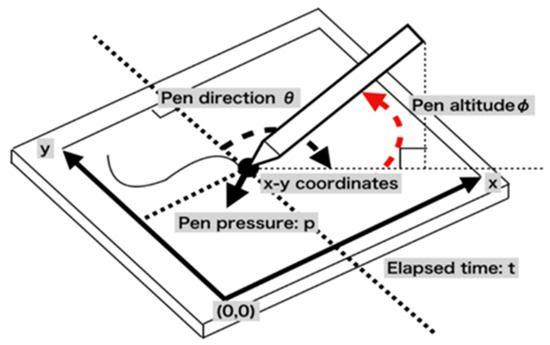 Handwriting data were recorded using a pen tablet system (Cintiq Pro 16, Wacom Co., Ltd., Saitama, Japan). The tablet was connected to a laptop PC running Windows 10. Figure 2 illustrates the coordinates of the parameters generated by the pen tablet.The screen size of the pen tablet was 15.6 inches, and the resolution size was pixels.
